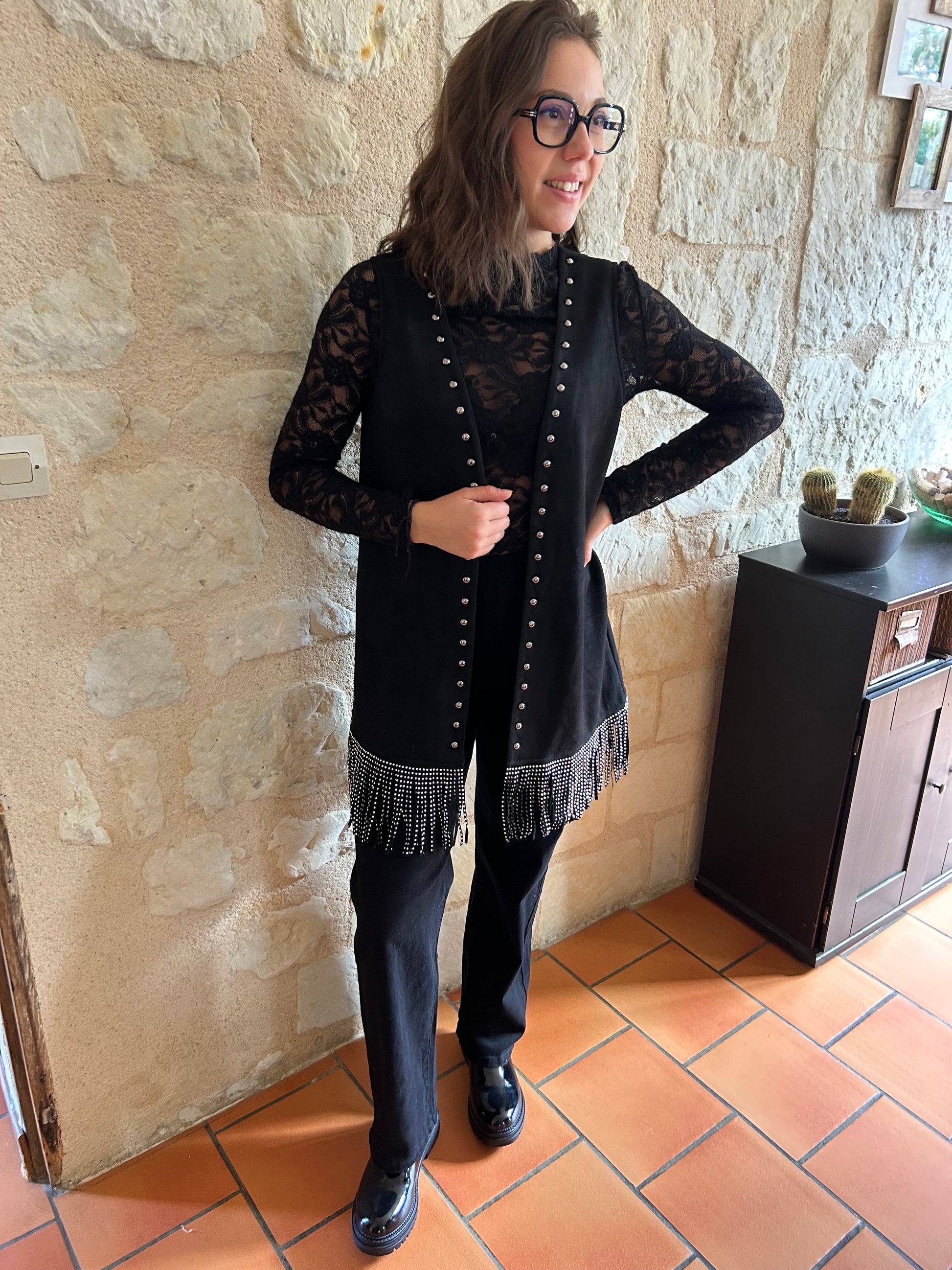 Ce gilet noir, en taille unique, mettra une touche de rock tout en gardant un côté classe dans votre tenue.