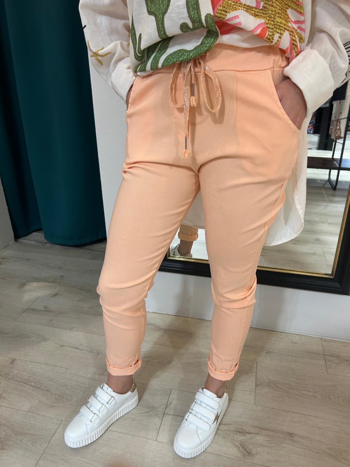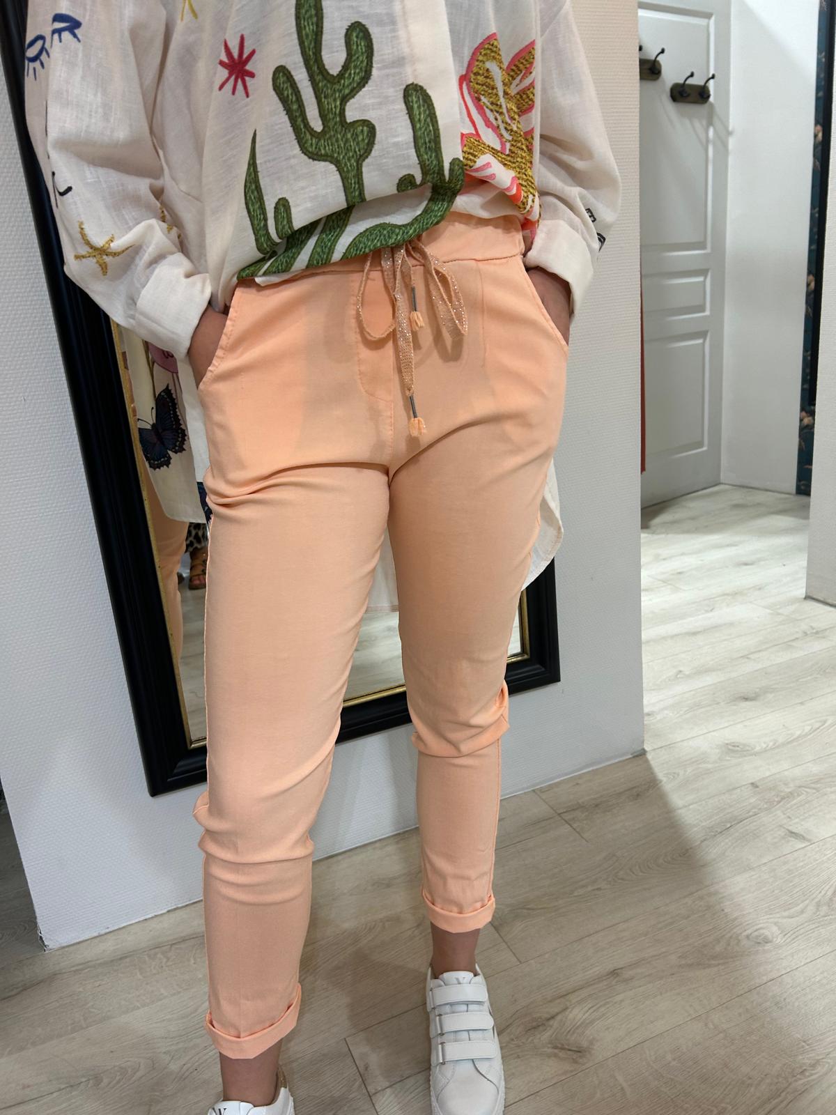 Le pantalon magique, taille élastiquée, s’adapte à toutes les morphologies jusqu’au 42. Confort absolu et couleur pêche lumineuse pour un look frais et facile à porter.